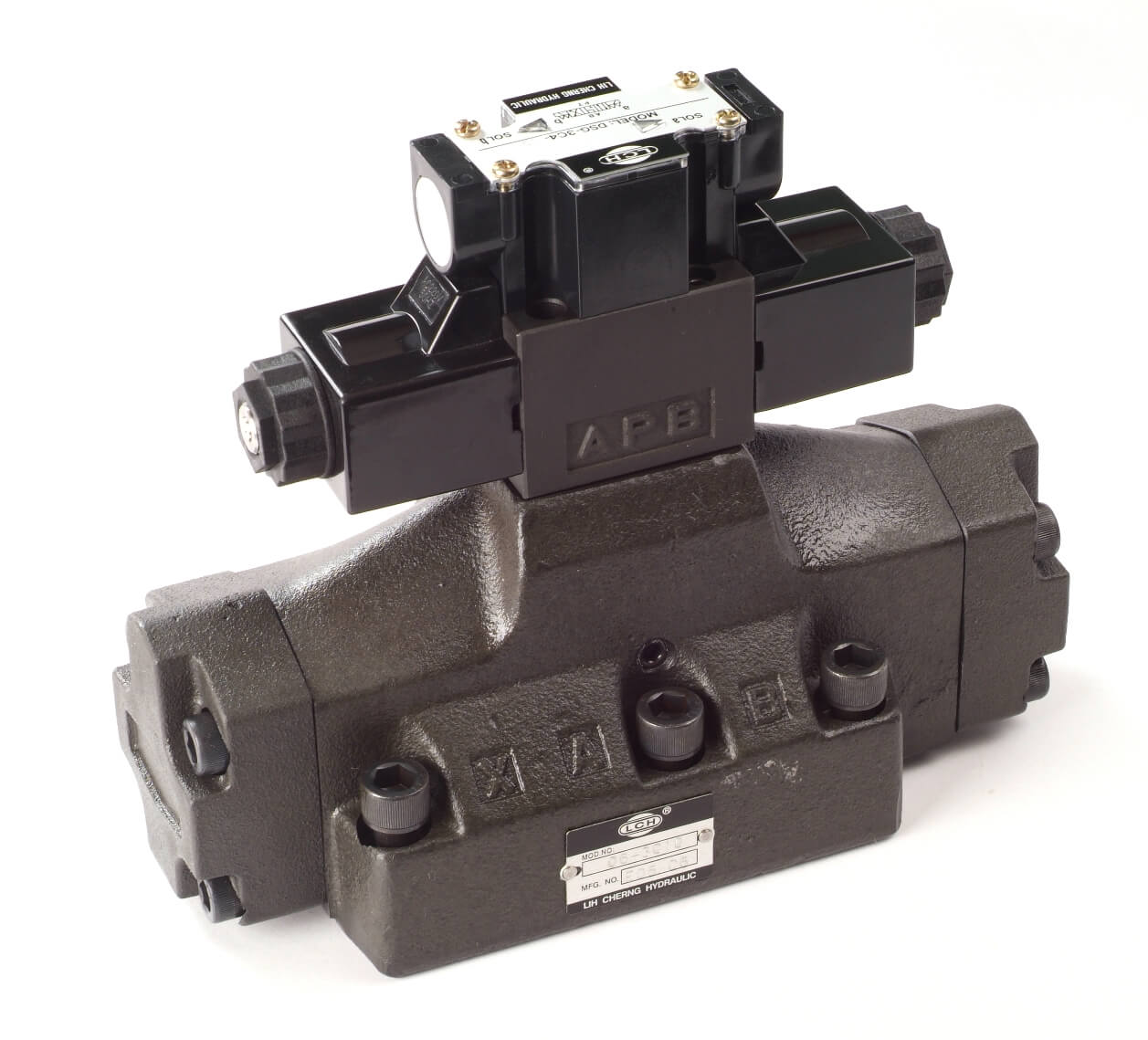 註:電磁引導換向閥是由電磁換向閥和引導換向閥搭配組合,當電磁閥線圈通電時引導換向閥切換引導油流的方向,並以推動引導換向閥軸,因此改變油壓系統油路流的方向。